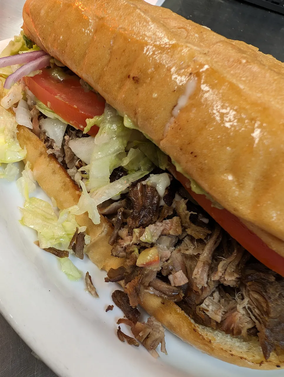 Gigantic soft Telera (bread) slightly toasted on the inside, with guacamole, beans, lettuce, sliced tomato & onions, melted cheese, and simmered pork.