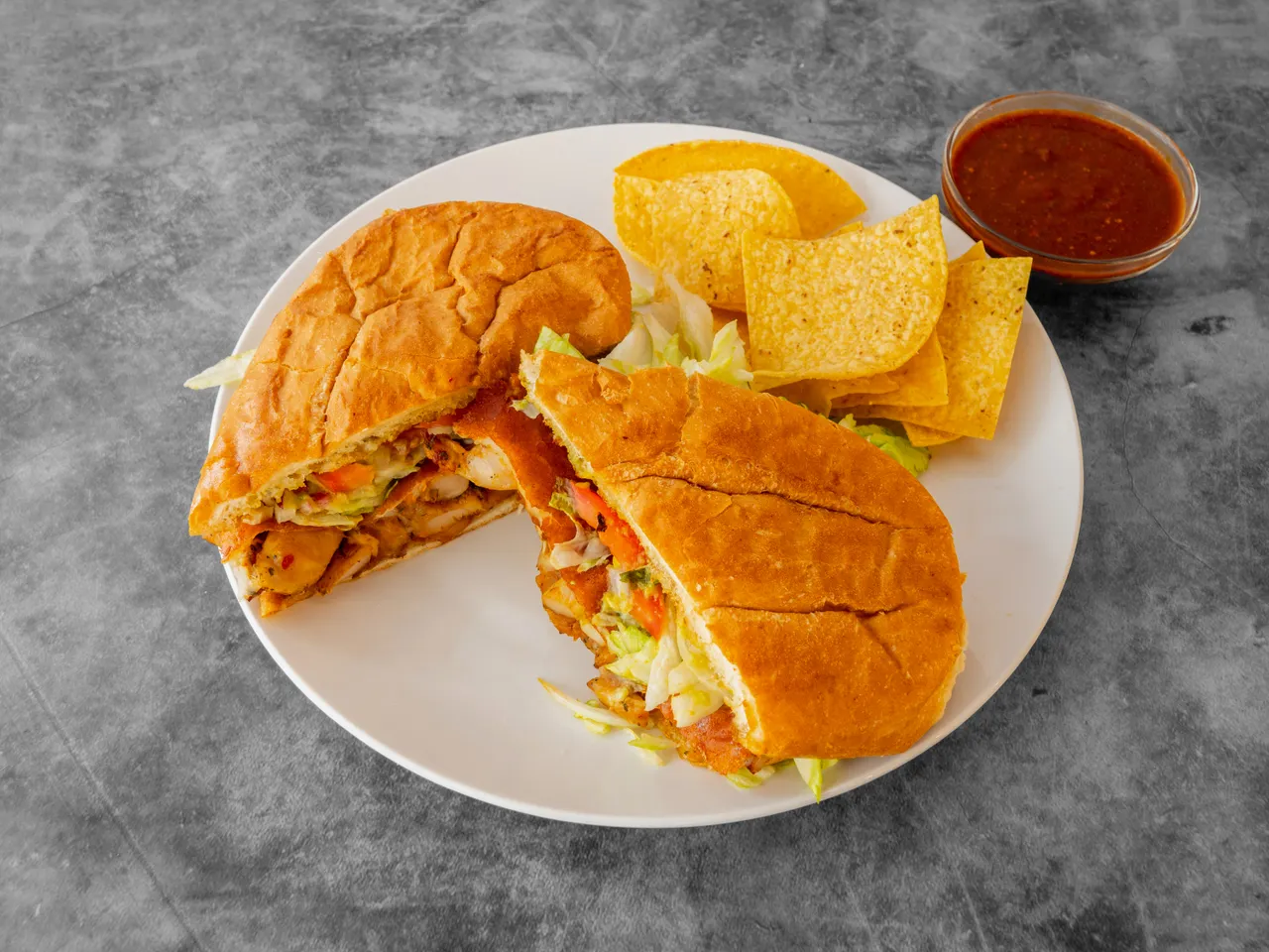 Gigantic soft Telera (bread) slightly toasted on the inside, with guacamole, beans, lettuce, sliced tomato & onions, melted cheese, and seasoned chicken grilled to perfection.