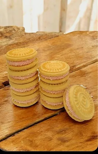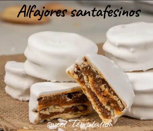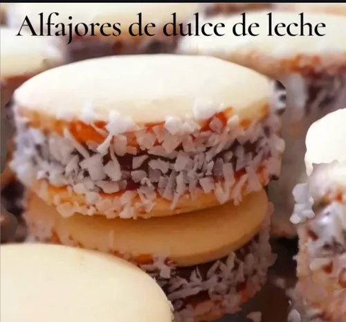 Argentine cornstarch sandwich cookies, filled with dulce de leche a (creamy caramel confection) rolled in shredded coconut along the edges.